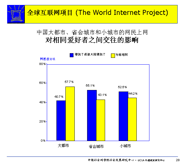 從中國(guó)的調(diào)查數(shù)據(jù)看,大都市網(wǎng)民認(rèn)為上網(wǎng)增加了他們跟有相同業(yè)余愛好或相同娛樂活動(dòng)的人的交往的人數(shù)要明顯少于省會(huì)城市和小城市。