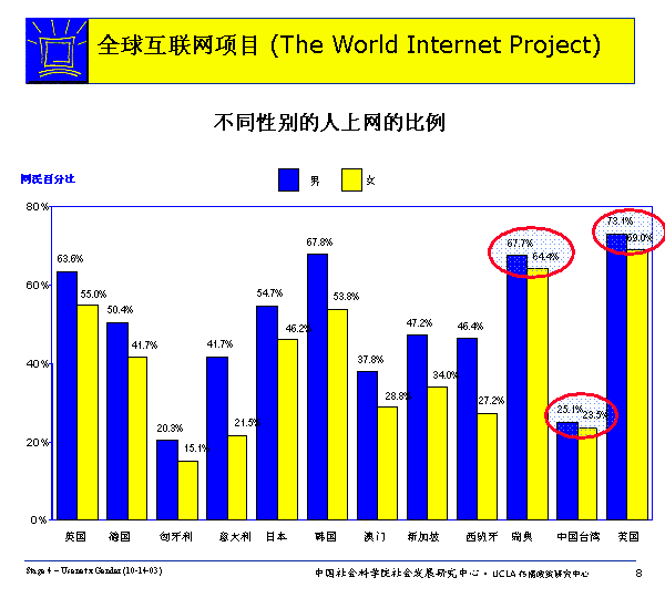 在WIP所有國家里,男性比女性更可能上網(wǎng)。男性和女性上網(wǎng)比例的差異因國家而異,瑞典、臺灣和美國的男女上網(wǎng)比例幾乎沒有差異,而意大利、新加坡和西班牙的男女上網(wǎng)比例則差異很大。
