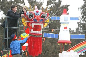 工作人員一月十七日在北京勞動(dòng)人民文化宮安裝調(diào)試巨龍?jiān)煨偷娘L(fēng)箏和神州飛船造型的彩燈。來自濰坊的風(fēng)箏與天津的彩燈春節(jié)期間一同亮相太廟民俗文化游園會(huì),扮靚節(jié)日的京城。中新社記者:毛建軍