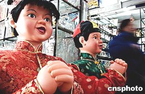 云集中國各地五百多家商戶的北京天外天小商品批發(fā)市場(chǎng)內(nèi),一對(duì)童男童女玩偶在中國農(nóng)歷甲申猴年來臨前夕向來往客商拜賀新年,增添濃濃節(jié)日氣氛。中新社記者:鄒憲