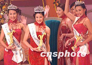 2004年度國際華裔小姐競選決賽一月十七日晚在香港舉行,來自二十一個不同國家和地區(qū)的選手參加了角逐,來自溫哥華的佳麗鐘嘉欣獲得冠軍、香港佳麗曹敏莉(左)獲得亞軍、馬尼拉佳麗洪巧玲獲得季軍。作者:錢興強