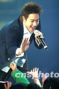 一月十八日晚,中央電視臺《音樂現(xiàn)場》春節(jié)特別節(jié)目“紅歌匯2003之?dāng)y手同行、治安之歌——慰問首都公安干警演唱會(huì)”在北京舉行,著名歌手潘瑋柏受到歌迷的熱烈歡迎。中新社記者:盛佳鵬