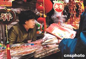 大批北京市民在農(nóng)歷甲申候年春節(jié)來臨前,突擊采購拜年禮品。北京天外天小商品批發(fā)市場內(nèi),制作精美的紅包等成為人們節(jié)前采購的熱點(diǎn)。中新社記者:鄒憲