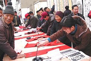 河南許昌尚集鎮(zhèn)書畫村的農(nóng)民書法家們?yōu)榇迕窳x寫春聯(lián)。尚集鎮(zhèn)民風(fēng)古樸,文化氛圍濃厚,一直保留著習(xí)書的傳統(tǒng)。作者:慎重