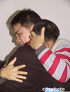 因涉嫌在海南從事間諜活動(dòng)被拘押的臺(tái)灣人宋孝濂在海南看守所與前來探視的兒子宋睿庭相抱痛哭。作者:王辛莉