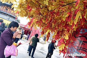 春節(jié)將至,上海龍華寺門前的一棵許愿樹吸引了不少市民,眾多路人紛紛駐足在許愿樹前為新年祈福。中新社記者:湯彥俊