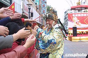 活動中裝扮一新的“財(cái)神”正給市民和游客派利是(紅包)。作者:何雪妍