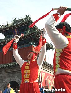 在東岳廟第三屆北京民俗文化節(jié)暨第六屆東岳文化廟會(huì)上,來(lái)自河南新鄉(xiāng)的農(nóng)民正在表演熱情奔放的乾坤大鼓,慶祝新春的到來(lái)。中新社記者:張勤