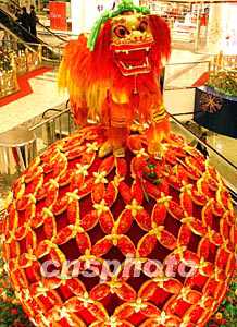 圖:香港一商廈內醒目的“獅子滾繡球”