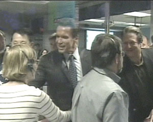 據(jù)美國有線新聞網(wǎng)消息,美國加州州長施瓦辛格(右三)在“機(jī)遇”號火星探測器成功登陸火星后,親臨指揮室向現(xiàn)場人員表示祝賀。(電視截圖)