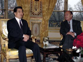 二十六日下午,希拉克和胡錦濤在法國(guó)總統(tǒng)府舉行小范圍會(huì)談