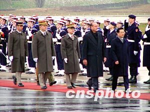 中國國家主席胡錦濤乘專機于巴黎時間下午兩點四十分抵達巴黎奧利機場,開始對法國進行國事訪問,法國總統(tǒng)希拉克夫婦親自到機場迎接。圖為胡錦濤在希拉克陪同下,檢閱法國三軍儀仗隊。作者:曹偉