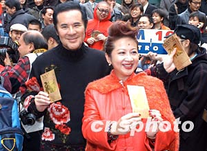香港新城電臺(tái)1月27日舉行甲申猴年新春團(tuán)拜,新城電臺(tái)行政總裁甘國(guó)亮與《家天下》主持薛家燕在新春團(tuán)拜活動(dòng)上大派利是。作者:鄧慶樂