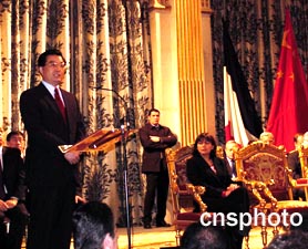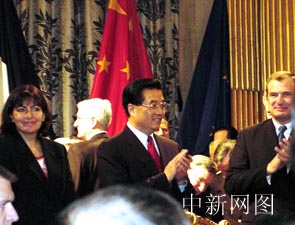 上午十一時半,在軍樂隊和儀仗隊的列隊引導(dǎo)下,胡錦濤主席健步邁入巴黎市政廳燈火輝煌的節(jié)日大廳,受到巴黎市官員、議員、各國駐法使節(jié)等一千多各界人士的鼓掌歡迎。