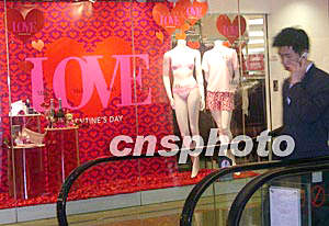 2月2日,香港一百貨公司櫥窗里寫上“LOVE”,并以性感內(nèi)衣作招徠,象征濃情密意。雖然離2月14日的情人節(jié)還有些日子,但是商家的宣傳攻勢已經(jīng)讓人感受到愛意撲面而來。作者:譚達(dá)明