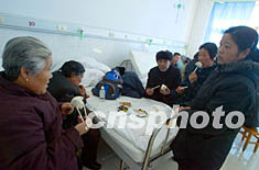 北京密云縣元宵節(jié)之夜重大傷亡事件中的受害者家屬,六日忍著悲痛在病床上吃午餐。中新社記者:宋吉河