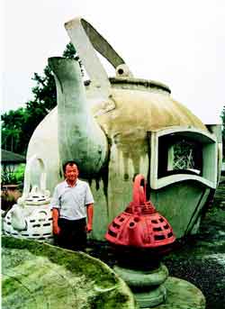 莊文亮最得意的是一組叫做“五‘壺’臨門(mén)”的五個(gè)大型茶壺。這五個(gè)大型茶壺,最大的直徑20尺,最小的16尺,比一般的涼亭還要大得多,說(shuō)它是一棟小房子也不為過(guò)。只是這五個(gè)大茶壺如果真要拿來(lái)泡茶,一壺茶恐怕就要上百斤茶葉、幾十噸的水,非得出動(dòng)大吊車(chē)才行。
