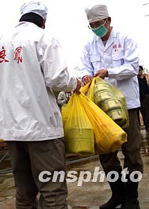 廣西南寧市良鳳農(nóng)牧公司工作人員十一日為飼養(yǎng)員送來晚飯,這家年產(chǎn)商品代雞苗1500萬羽的養(yǎng)殖場,一直堅持嚴(yán)格的規(guī)章制度,養(yǎng)殖場不許無關(guān)人員進入,飼養(yǎng)員的一日三餐都要專人送取,確保場內(nèi)無病菌。中新社記者:宋吉河