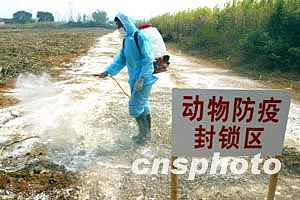 中國內地首發(fā)禽流感疫點--隆安縣丁當電灌站入口二月十二日工作人員在定時消毒。疫情發(fā)生后,這里嚴格按照規(guī)定進行定時消毒。中新社記者:宋吉河