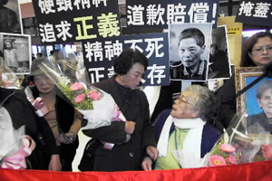 中新網(wǎng)2月12日電 前往日本東京高院聆聽(tīng)判決的3名臺(tái)灣地區(qū)慰安婦11日下午返回臺(tái)灣,她們對(duì)于日本東京高院判決她們敗訴很不滿,并悲憤的說(shuō),她們的官司一定要打到底。