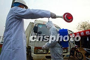 記者今天隨國務(wù)院新聞辦組織的中外記者團(tuán)前往南寧興寧區(qū)疑似禽流感疫區(qū)采訪,汽車行駛十分鐘后,速度忽然減慢,記者看到,在進(jìn)入興寧區(qū)的一個路口,六位身穿隔離服,背著噴霧器的工作人員正仔細(xì)地為進(jìn)出的每一輛車進(jìn)行消毒。