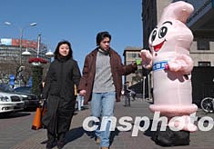 二月十四日是西方“情人節(jié)”,一家安全套銷售商在北京西單街頭向青年男女免費(fèi)派送安全套,許多情侶坦然接受。中新社記者:張煒