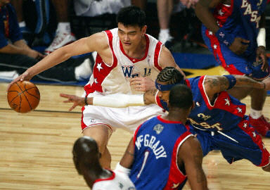 中新網(wǎng)2月16日電 北京時(shí)間今天上午,NBA全明星賽在美國(guó)西部城市洛杉磯進(jìn)行。中國(guó)球員姚明繼去年以狀元秀的身份入選2003年全明星賽事的西部首發(fā)陣容后,今年再次代表巨星云集的西部球隊(duì)出戰(zhàn)。本場(chǎng)比賽,西部全明星隊(duì)136-132擊敗東部全明星隊(duì),姚明在比賽中表現(xiàn)出色,上場(chǎng)19分鐘,貢獻(xiàn)16分,4個(gè)籃板和1次助攻,得分在所有球員中排名第五。