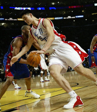 北京時(shí)間今天上午,NBA全明星賽在洛杉磯開戰(zhàn),中國(guó)球員姚明所效力的西部全明星隊(duì)以136-132擊敗了東部全明星隊(duì)。圖為姚明在比賽中帶球突破。