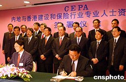 二月十七日,中國(guó)內(nèi)地與香港建設(shè)、保險(xiǎn)行業(yè)專業(yè)人士資格互認(rèn)協(xié)議簽署儀式在北京飯店舉行,中國(guó)商務(wù)部副部長(zhǎng)安民、香港特區(qū)政府財(cái)政司司長(zhǎng)唐英年等出席了簽署儀式。中新社記者:武仲林