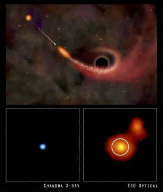 歐洲和美國天文學(xué)家18日宣布,他們借助太空望遠(yuǎn)鏡在一個(gè)距地球7億光年的星系中觀測(cè)到了耀眼的X射線爆發(fā)?茖W(xué)家相信,這是被位于該星系中央的黑洞所吞噬的一顆恒星發(fā)出的“臨終呼叫”。這是科學(xué)家首次找到超大質(zhì)量黑洞撕裂恒星的強(qiáng)有力的證據(jù)。
