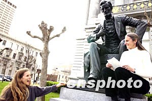 相戀十二年的諾艾爾(左)和黛安娜(右)是二月二十日從舊金山市政府領到結婚證書的第七十二對同性伴侶,她們和其他同性伴侶一樣在市政廳外的林肯像前合影。從二月十二日起,舊金山市政府決定給同性戀者發(fā)放結婚證書,舊金山一時成為同性戀者向往的地方。作者:陳鋼