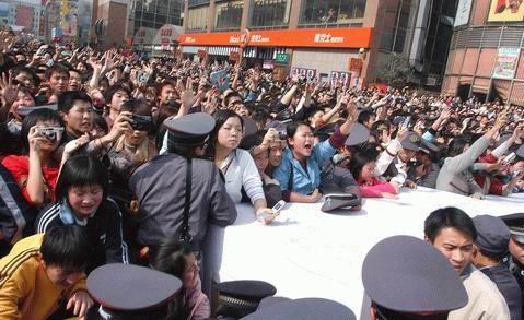 臺(tái)灣人氣小天后蕭亞軒昨(22)日亮相成都宣傳某彩妝品牌時(shí),引發(fā)歌迷騷亂。上萬名瘋狂的歌迷在蕭亞軒出現(xiàn)在春熙路步行街后,沖破300多名保安和警察組成的人墻,將現(xiàn)場(chǎng)的記者席沖得七零八落,蕭亞軒嚇得歌未唱完就被經(jīng)紀(jì)人攔腰抱出包圍圈匆匆離去。雖然現(xiàn)場(chǎng)負(fù)責(zé)人及時(shí)中止了活動(dòng),最終仍有一名男歌迷因現(xiàn)場(chǎng)太亂被擠倒在地,好幾名女生的鞋子也被擠丟在了現(xiàn)場(chǎng)。