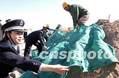 二月二十五日,北京再次刮起六級大風(fēng),朝陽城市管理監(jiān)察大隊太陽宮分隊對轄區(qū)內(nèi)部分施工工地的“揚沙、粉塵”現(xiàn)象檢查,監(jiān)督施工部門嚴(yán)密覆蓋裸露土渣,減少對空氣的污染。中新社記者:任海霞