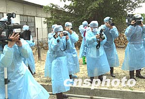 澳門(mén)特區(qū)民政總署和珠海出入境檢驗(yàn)檢疫局一日在珠海舉行會(huì)議,就恢復(fù)因禽流感而中斷的活雞輸入問(wèn)題進(jìn)行協(xié)商并達(dá)成共識(shí),雙方?jīng)Q定報(bào)國(guó)家有關(guān)部門(mén)批準(zhǔn)后,從三月五日起同步恢復(fù)活雞、冰鮮雞、和凍雞的供應(yīng)。圖為前往珠海養(yǎng)雞場(chǎng)采訪的眾媒體記者們?yōu)榇_保雞只的健康,也不得不穿上隔離防護(hù)服工作。作者:李剛