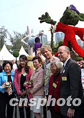 3月5日,出席“2004年香港花卉展”的民政事務局常任秘書長李麗娟、香港旅游發(fā)展局主席周梁淑怡議員等嘉賓,在香港迪斯尼樂園設計的花壇攤位留影。作者:洪少葵