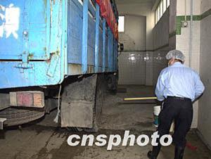 圖為裝載著禽類產(chǎn)品的運輸車輛在進入澳門南粵批發(fā)市場后,工作人員為車輛進行消毒。