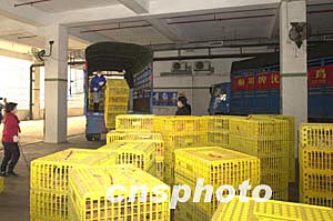 圖為澳門南粵批發(fā)市場的工作人員將首批活雞運進場內(nèi)。
