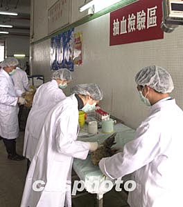 圖為在澳門南粵批發(fā)市場,醫(yī)務(wù)人員當場將雞只抽血檢驗。