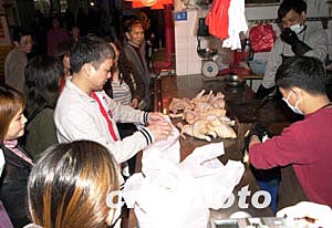 內(nèi)地五日開(kāi)始為澳門(mén)恢復(fù)活雞供應(yīng)受到澳門(mén)市民的歡迎,經(jīng)澳門(mén)衛(wèi)生檢疫部門(mén)檢驗(yàn)后雞只下午開(kāi)始在街市銷(xiāo)售,聞?dòng)嵑蟮氖忻窦娂姷绞袌?chǎng)排隊(duì)購(gòu)買(mǎi),僅一個(gè)多小時(shí),在佑漢街市銷(xiāo)售的四百五十多只活雞就基本售磬。作者:李剛