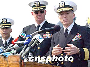 美國(guó)太平洋第七艦隊(duì)?wèi)?zhàn)斗群司令凱利(右一)在“小鷹”號(hào)航空母艦舉行的歡迎儀式上,向媒體介紹該有關(guān)情況及回答記者問(wèn)。作者:錢(qián)興強(qiáng)