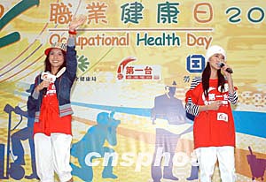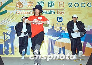 歌星何韻詩3月6日在香港出席由職安局及勞工處舉辦之《職安健康日2004》開幕典禮活動(dòng),「職安領(lǐng)隊(duì)」何韻詩帶領(lǐng)出席嘉賓及歌星進(jìn)行健康操,宣揚(yáng)職業(yè)安全信息。作者:鄧慶樂
