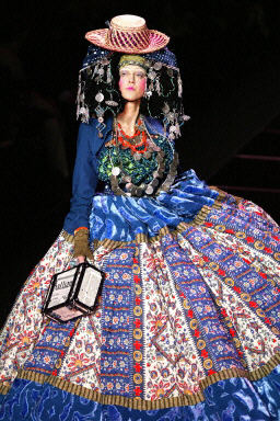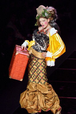 3月6日,在巴黎2004/2005秋冬時(shí)裝周上,模特展示設(shè)計(jì)師John Galliano的另類時(shí)裝。