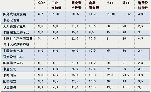 2003年中國(guó)全年GDP增長(zhǎng)9.1%,達(dá)到1997年以來(lái)GDP的最高增速。目前經(jīng)濟(jì)學(xué)界較為一致的看法是,中長(zhǎng)期中國(guó)經(jīng)濟(jì)仍可保持強(qiáng)勁的增長(zhǎng)勢(shì)頭,但對(duì)于GDP能否保持去年的增速或者超過(guò)去年的增速卻有很大分歧。一種觀點(diǎn)認(rèn)為,2003年經(jīng)濟(jì)增長(zhǎng)達(dá)到短周期波動(dòng)的波峰,2004年將進(jìn)入短周期波動(dòng)的收縮期,經(jīng)濟(jì)增長(zhǎng)速度將出現(xiàn)小幅度下降。另一種觀點(diǎn)認(rèn)為,中國(guó)經(jīng)濟(jì)可能突破傳統(tǒng)的周期,2004年GDP增速可能再創(chuàng)新高。而《證券市場(chǎng)周刊》特邀10家機(jī)構(gòu)所作的2004年一季度宏觀經(jīng)濟(jì)預(yù)測(cè)也體現(xiàn)了這兩種不同的觀點(diǎn)。