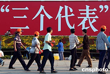 十屆全國人大二次會(huì)議三月十四日對(duì)憲法修正案草案進(jìn)行表決,“三個(gè)代表”重要思想正式寫入中國新憲法。圖為北京天安門廣場上的“三個(gè)代表”巨幅標(biāo)語牌。中新社記者:張煒