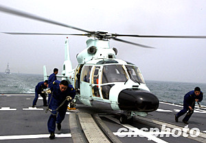 三月十六日,在青島進(jìn)行的中法聯(lián)合軍事演習(xí)中,中國海軍112驅(qū)逐艦上直升機正在迅速起飛。中新社記者:宋吉河