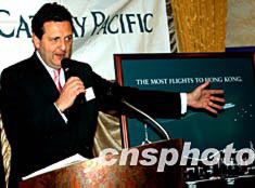 香港國泰航空公司美洲高級副總裁韋棟當?shù)貢r間三月十八日率領(lǐng)多名高層管理人士從洛杉磯東進紐約,為將于今年七月一日正式啟動的香港--紐約直飛航線作熱身宣傳。作者:趙海燕