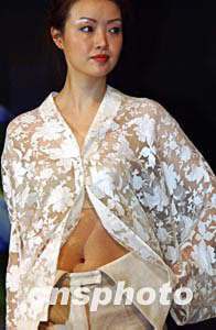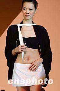 “2004香港國(guó)際春季時(shí)裝材料展”三月二十三日在香港會(huì)展中心開(kāi)幕,參展設(shè)計(jì)師在展會(huì)上推出選用不同面料設(shè)計(jì)的時(shí)裝,簡(jiǎn)潔、典雅。中新社傳真 錢興強(qiáng) 攝