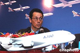 空中客車公司價格政策高級副總裁奧利維安德列斯,三月二十四日在北京介紹擁有555個座位的超大型飛機(jī)-A380飛機(jī),并對中國市場前景極為樂觀。首架A380飛機(jī)今年五月開始總裝,二零零六年計劃投入運營。作者:王麗南