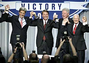 中新網(wǎng)3月26日電 據(jù)美聯(lián)社報(bào)道,民主黨人25日熱烈歡迎克里成為他們新的領(lǐng)導(dǎo)人,美國(guó)前總統(tǒng)克林頓、卡特、克里的競(jìng)選對(duì)手和前敵手都出席了克里的慶祝晚宴。競(jìng)選對(duì)手和前敵手們都表示,他們將把分歧放在一邊,與克里團(tuán)結(jié)合作以便在選舉中擊敗布什總統(tǒng)。