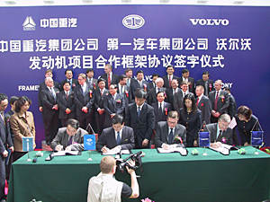 中新網(wǎng)北京3月29日電(通訊員郭化南 記者王魯平)在中國國內(nèi)重型卡車市場占有重要地位的中國重型汽車集團(tuán)有限公司和中國第一汽車集團(tuán)公司,今天在北京釣魚臺國賓館與世界發(fā)動機(jī)技術(shù)行業(yè)研究開發(fā)與生產(chǎn)制造巨頭瑞典沃爾沃集團(tuán)簽署了發(fā)動機(jī)生產(chǎn)合作框架協(xié)議,三方將聯(lián)合打造世界一流發(fā)動機(jī)生產(chǎn)基地。